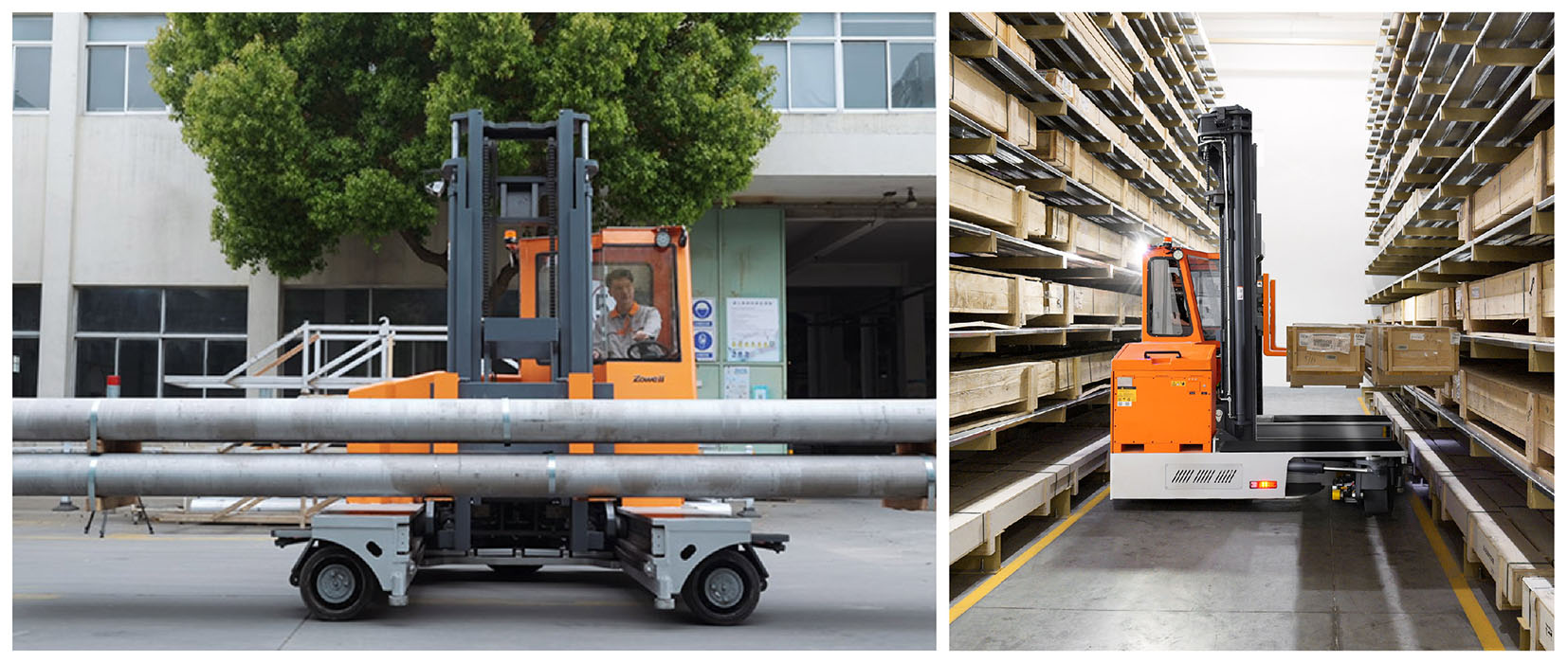 Il carrello elevatore elettrico multidirezionale della serie Zowel WSHM è progettato per la movimentazione di merci pesanti, ingombranti e molto lunghe in corridoi molto stretti.